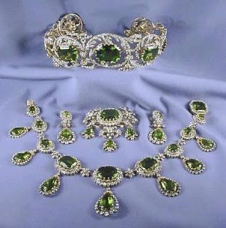An impressive Habsburg Peridot parure (photo at left) created in the 1820’s by the Imperial jewelers Kochert includes a tiara, necklace, earrings and corsage brooch. The parure was originally created for the Archduchess Henriette, wife of Archduke Charles, Duke of Teschen. It passed to The Archduke Karl Ferdinand and then to his nephew, Archduke Fredrich. His wife Isabella wore it for the coronation of Emperor Karl I of Austria and King of Hungary. In 1937 it was sold after her death at auction by Count Johannes Coudenhove-Kalergi whose daughter inherited the parure. After her death the parure was found in a bank vault wrapped in tea towels. By 2001 the set was sold to Fred Leighton Jewelers. The amazingly large Peridot in this set along with the unbelievable green color make this historical piece one of the finest collections of cut Peridot in jewelry.
