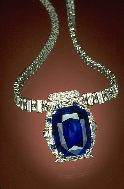 In times past, sapphire was reserved only for persons such as high ranking clergy or royal/noble persons. The Smithsonian displays the very rich deep blue sapphire known as the Bismarck Sapphire named after the Countess Mona Von Bismarck (shown at left). The sapphire weighs 98.60 carats and is set in a spectacular diamond necklace.